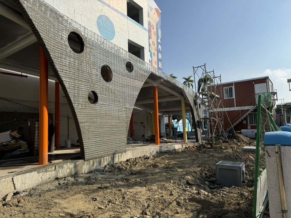 此案例施工的鋼網牆,是位於校舍一樓的外廊立面,整體設計核心是曲面流線造型,牆體由下而上呈現內收弧形,結合圓形穿孔配置,使原本設計較制式的校舍外牆,轉化為具有童趣與流動感的建築表情。